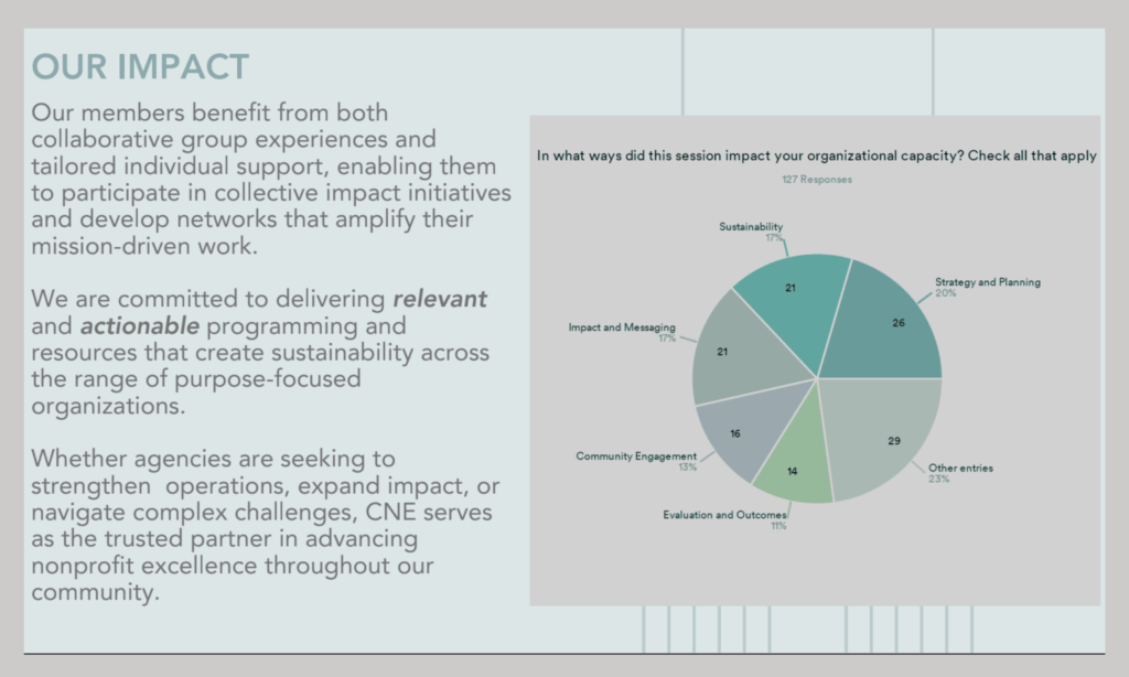 For Profit Businesses may also join CNE to learn more about nonprofit operations, board membership, and collective impact. They may attend workshops and conferences, and may also request individual education and support to meet their corporate goals in partnering with the nonprofit sector. The flat fee for these organizations is $500 annually.